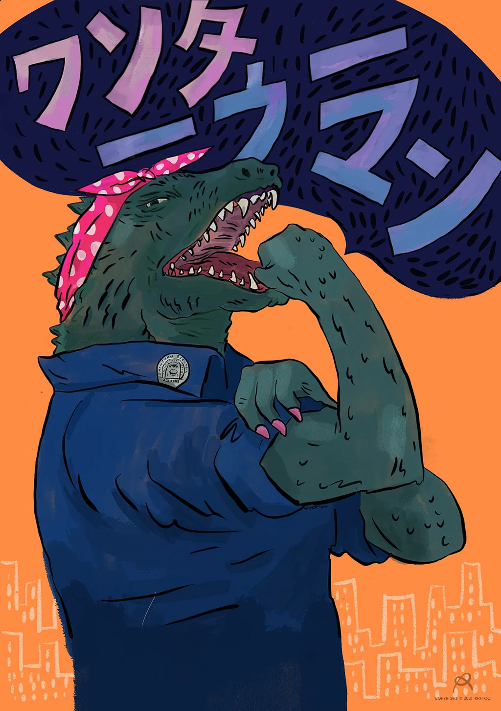 A private commission of Godzillette in the spirit of Rosie the Riveter.