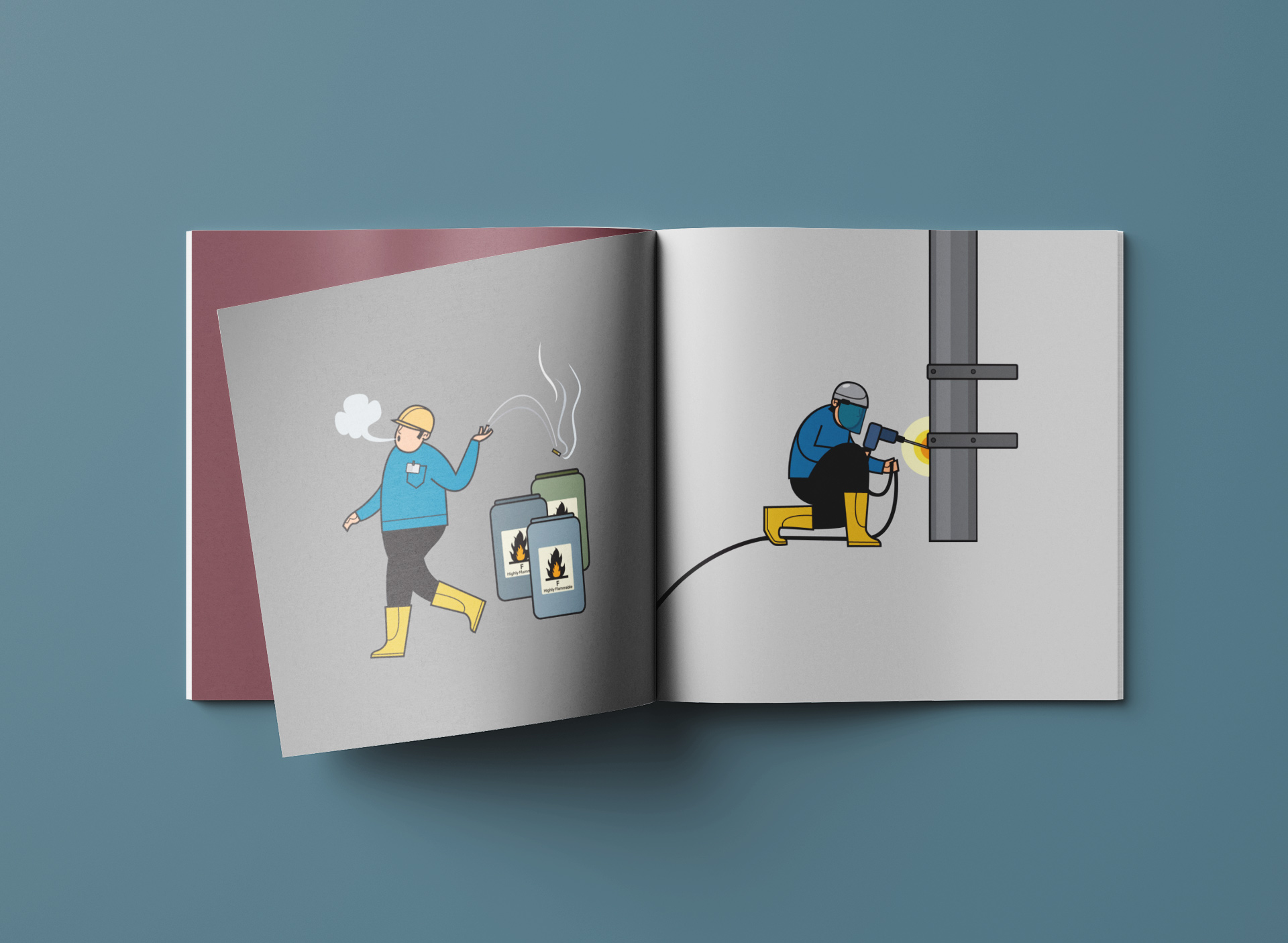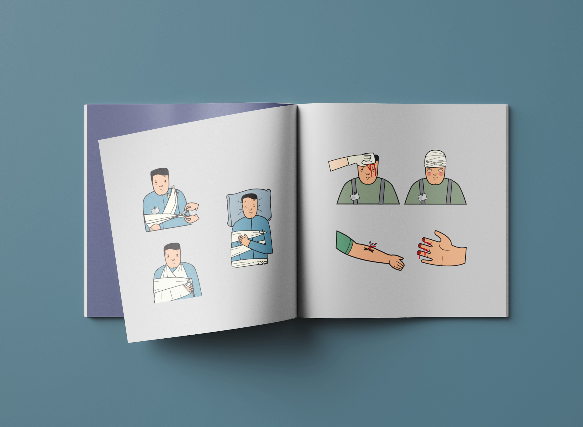A series of illustrations featuring workmen finding themselves in various regrettable worst-case scenarios (and how to pack a finger in ice, and still have it wriggling).